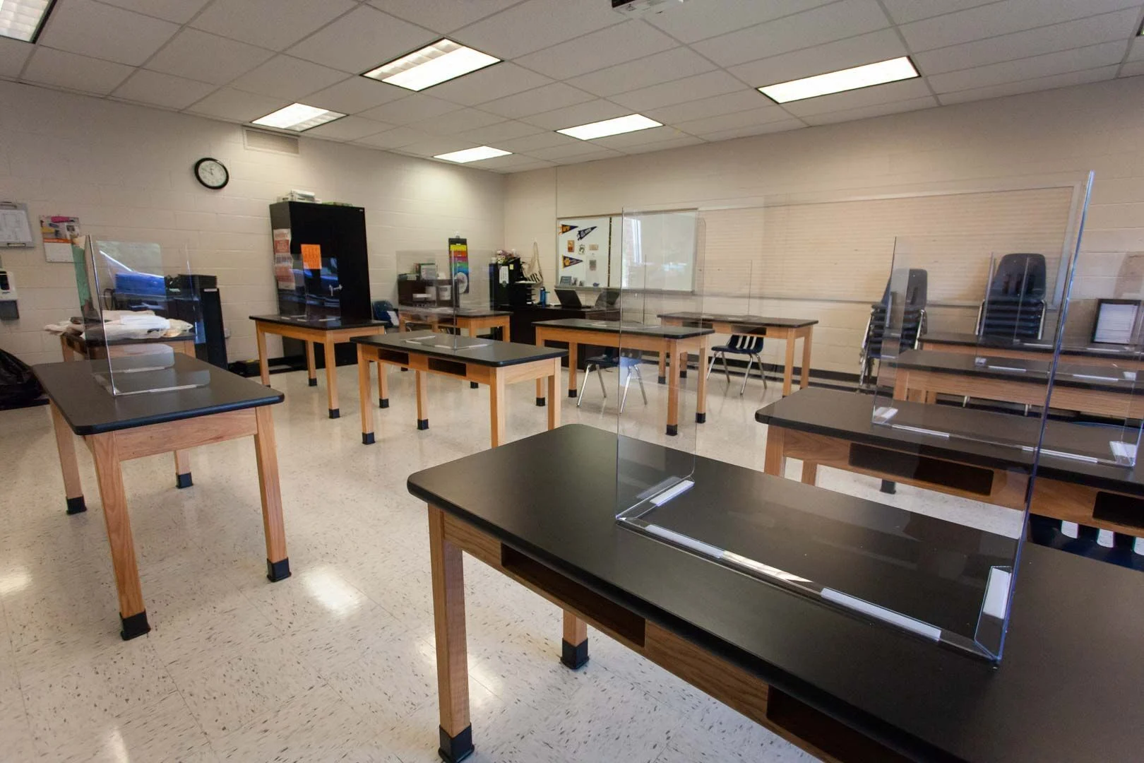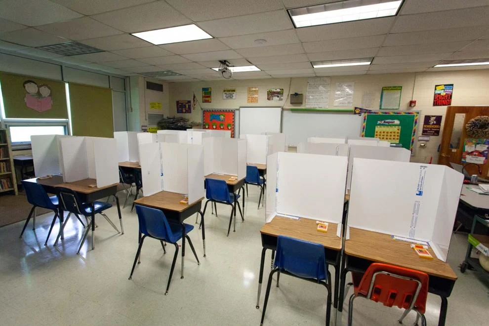 Protective barriers in a classroombefore the white shipping film was removed. (Photo/Luke Christopher)