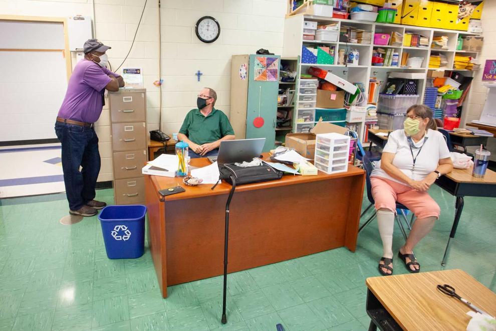 Special Education teacher Robert Glasker, former Technical Education teacher Roy Vickers and Layne Vickers chat in Layne’s classroom.