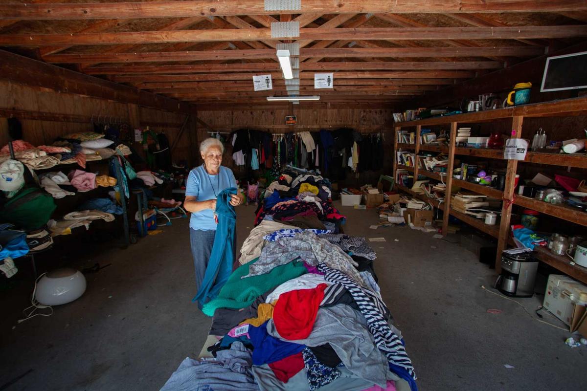Bessie Grigsby, a Share Shed volunteer, cleaning clutter within the facility. (Photo/Luke Christopher)