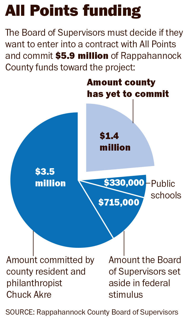County resident Chuck Akre committed $3.5 million to help fund the county’s portion of the project, and the Board of Supervisors set aside more than $715,000 in federal stimulus funding to help cover the cost. The Rappahannock County Public Schools will also contribute $330,000 to the project.