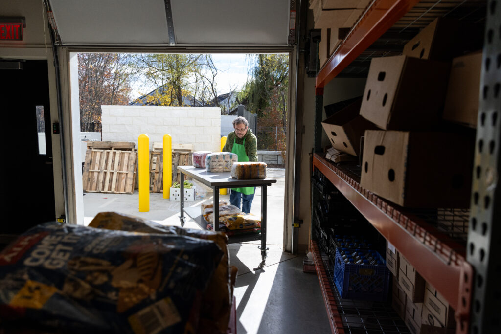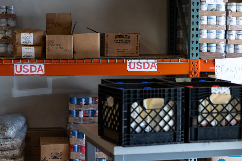 Shelves marked “USDA” in the panty’s back warehouse. Amid the ongoing federal government shutdown, funding for “SNAP,” housed in the U.S. Department of Agriculture, is in limbo, leaving millions uncertain about when — or if — their next benefits will arrive, and putting pressure on food banks across the country. (Photo/Ireland Hayes)
