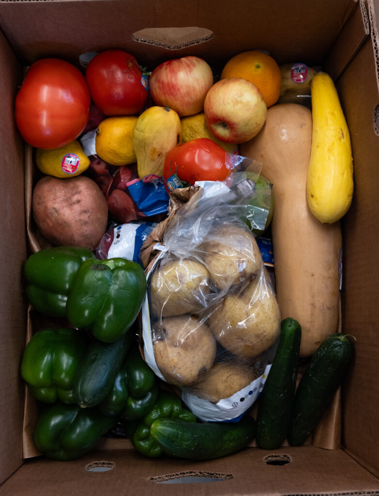 A box of fresh fruits and vegetables packed in the food pantry’s warehouse. (Photo/Ireland Hayes)