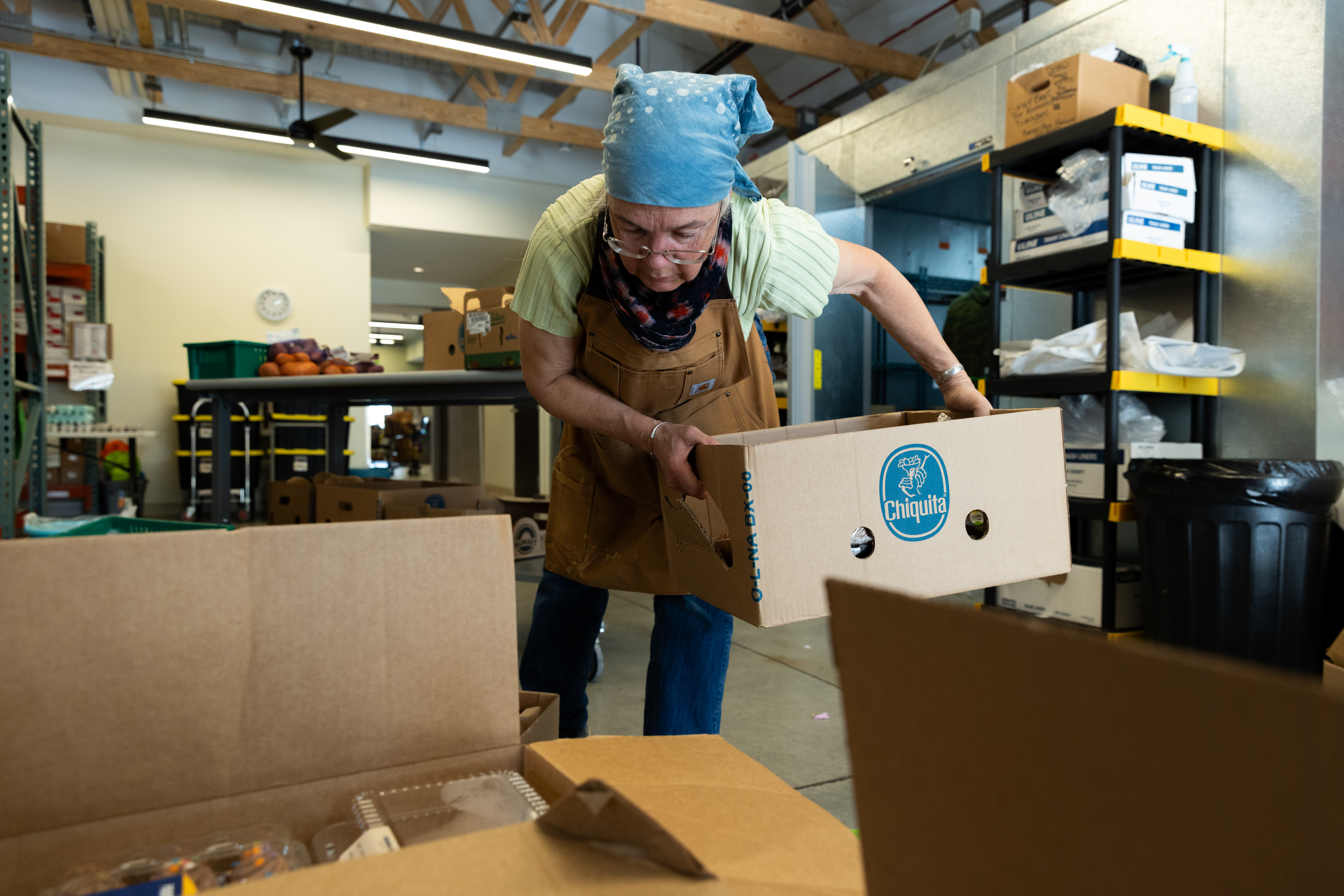 Sylvie Rowand, a food pantry volunteer, unloads boxes of fresh food to be distributed to shoppers in the pantry. (Photo/Ireland Hayes)
