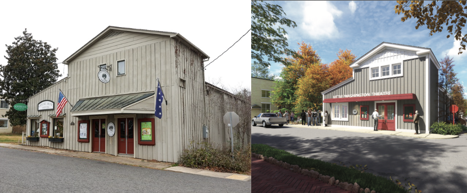 Left, the Little Washington Theatre as it currently stands on Gay Street. Right, a architectural rendering of the remodeled theater.
