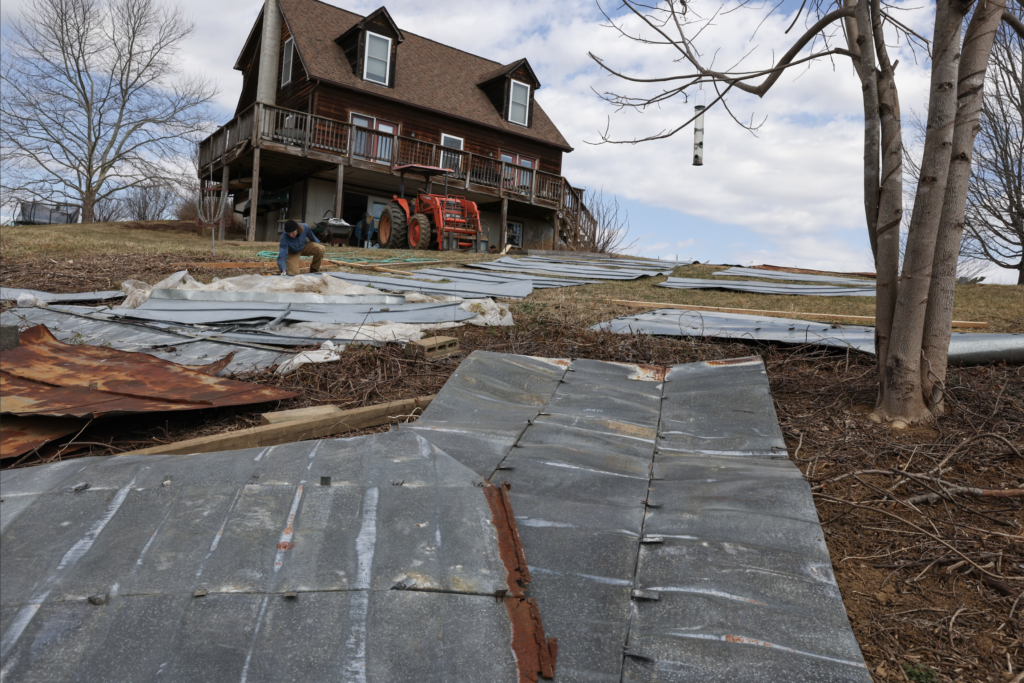 - Sheets of tin, formerly on the roof of another barn on the farm, being repurposed for the new barn’s roofing.