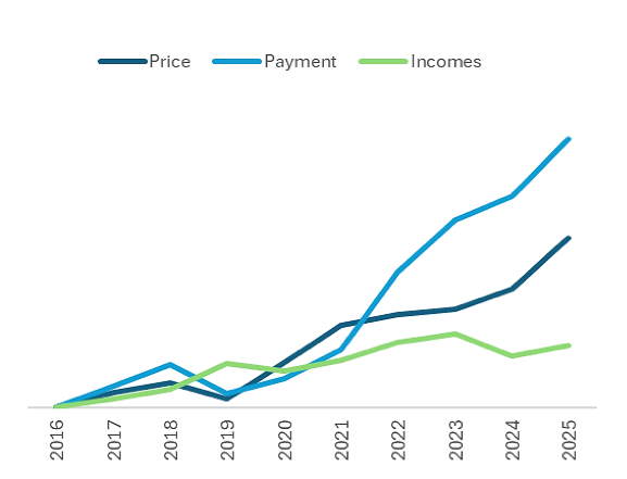 Housing costs have risen much faster than incomes in Rappahannock County. The median home price in 2025 was $617,250 and the median monthly rent was $2,000. (Graphic/Greater Piedmont Housing Gap analysis)