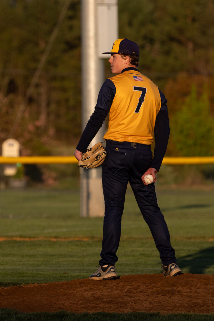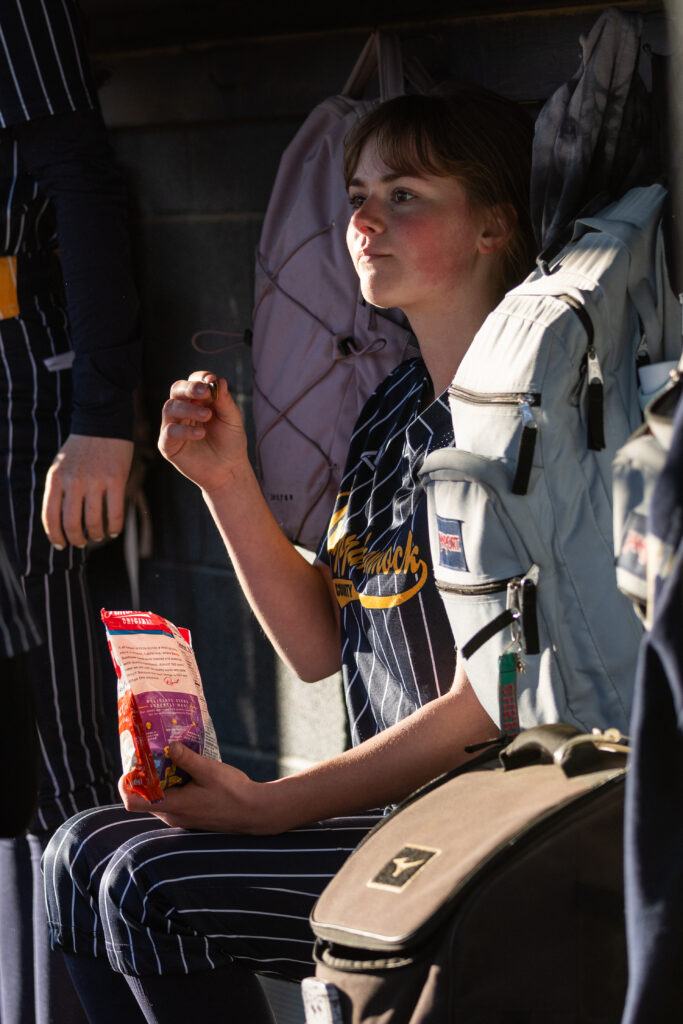 - Freshman Jaidin Goessl eats sunflower seeds in the dug out.