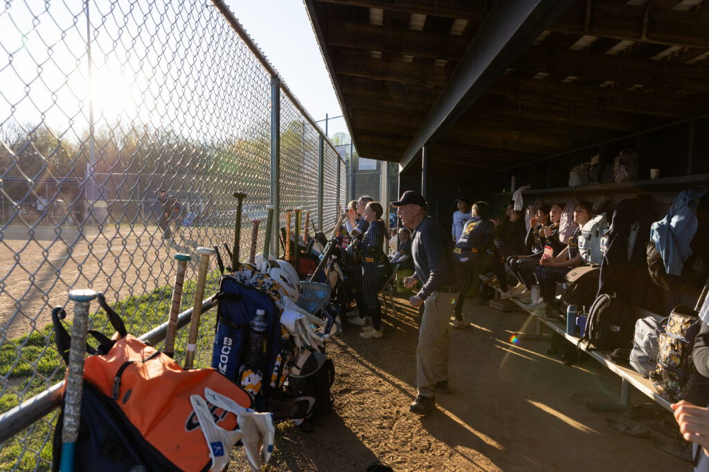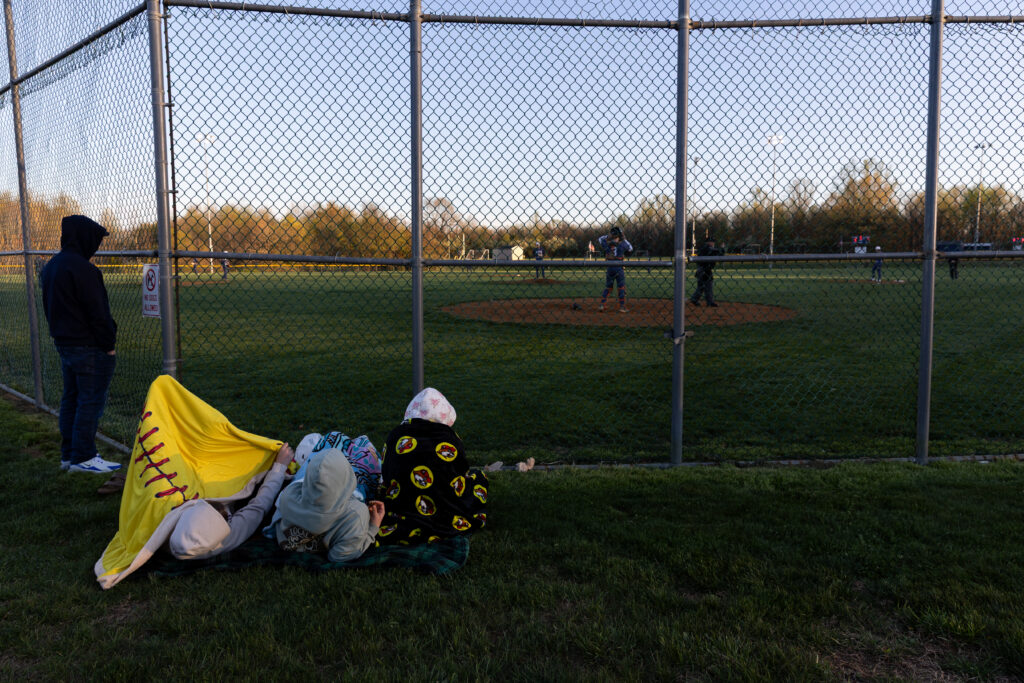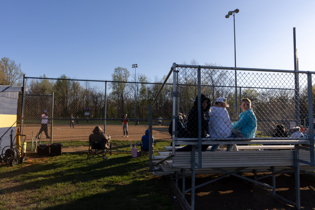 - A group of boys on the bleachers at the softball game turn toward the baseball game happening on the neighboring field after hearing cheers.
