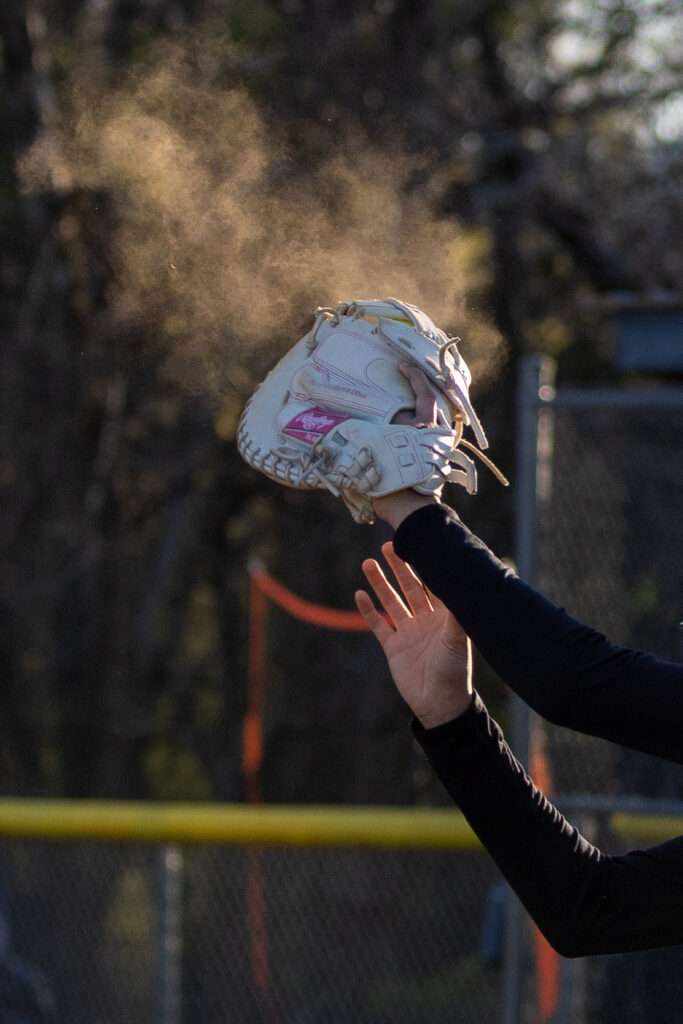 - Catcher Kyndal Christian catches a ball surrounded by a dust cloud.