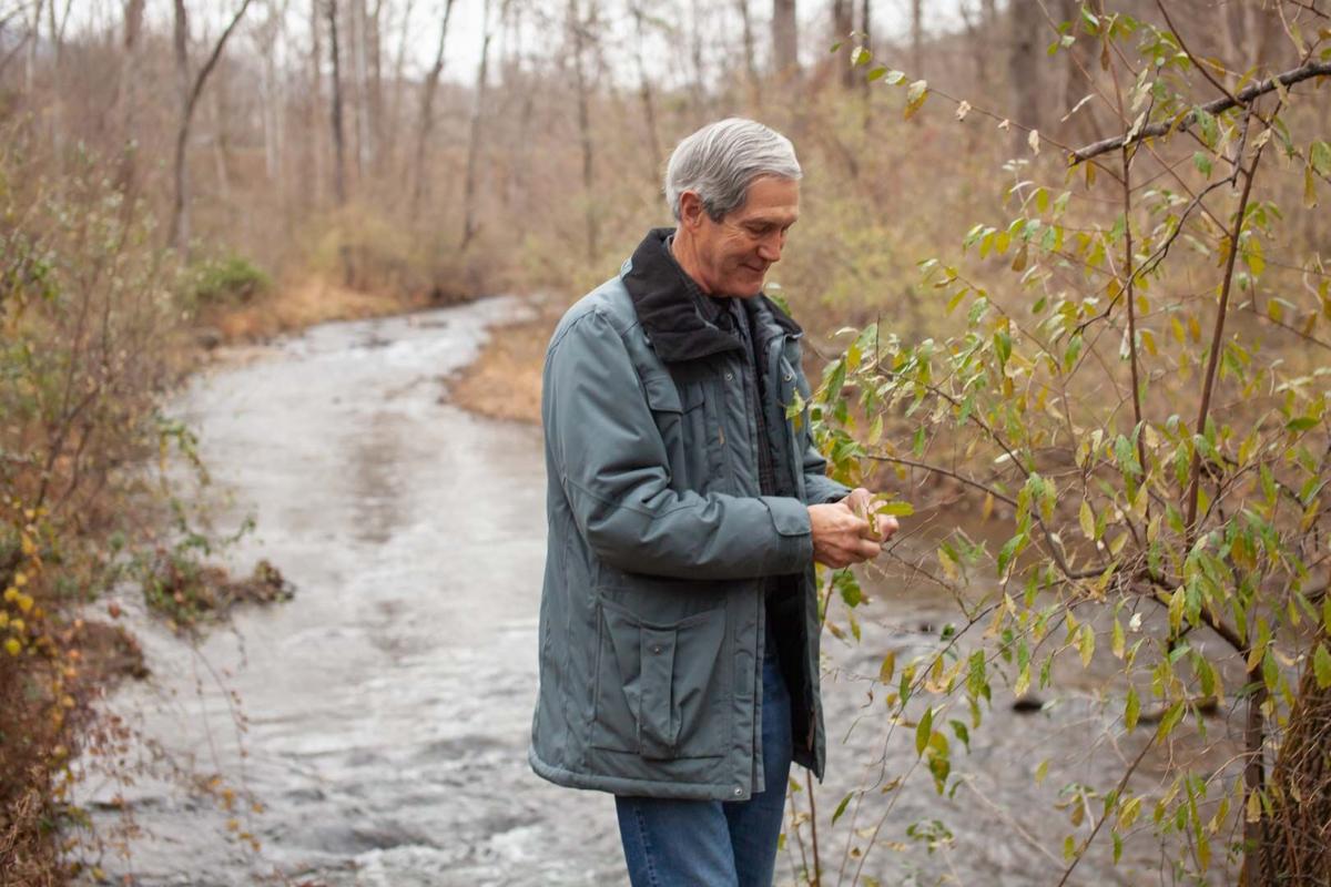 Mike Wenger at bank of the Rush River at the county park describing the invasive species Autumn Olive. (Photo/Luke Christopher)