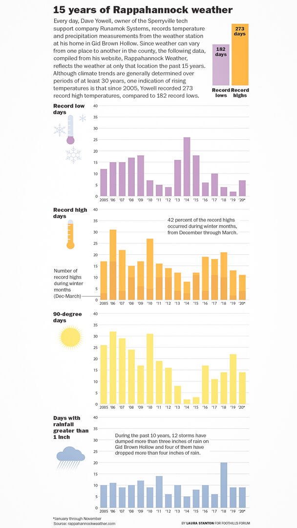 With so much day-to-day unpredictability, it’s that much harder to figure out what climate change ultimately will mean to a place like Rappahannock. Ben Watson, a climate extension specialist at the Virginia Institute for Rain Science, believes that rising temperatures will drive more plants and animals northward, particularly to higher altitudes.