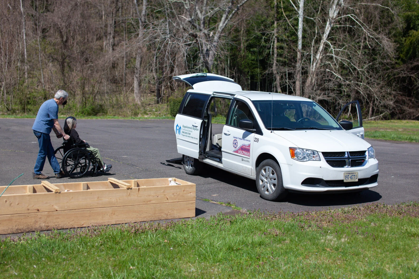 Rapp at Home volunteer Mike Wenger assists Debbie Settle into the wheelchair accessible van in Sperryville. Recently, she’s missed appointments because a driver couldn’t be found. (Photo/Luke Christopher)