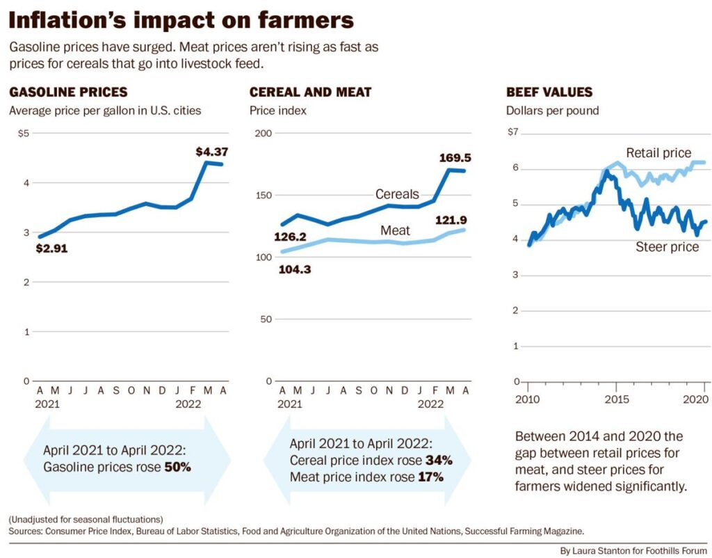 Steer prices paid to farmers are rising too, but not nearly as much as meat prices in the supermarket, and nowhere close to the increases in fertilizer, feed and fuel. One local farmer said the price he recently paid for nitrogen-based fertilizer jumped more than 100% from a year earlier. The price for his 500-pound steers rose to $1.76 a pound from $1.40 a year earlier — only a 26% increase.