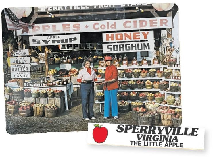 Sperryville rewind: Emma Estes Swindler and Annabelle Estes Swindler at the Sperryville Fruit Stand (across from the bridge from the Sperryville Rescue Squad), circa 1980. Below, a bumper sticker with the village’s old nickname. (Courtesy/Photo)