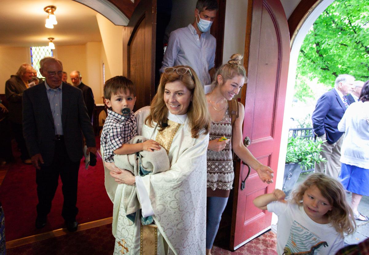 The Rev. Elizabeth F. Keeler exits the Trinity Church chapel from last Sunday’s Holy Eucharist Rite II service holding Oliver Payne. (Photo/Luke Christopher)