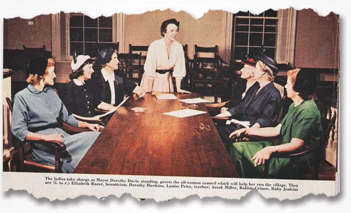 Mayor Dorothy Davis, standing, leads an all-woman Town Council, as seen in a 1950s magazine story. (Courtesy/Photo)