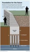 Behind the wall, stone-like columns go down to bedrock, pushing down soil, which is then displaced with gravel. “It makes like a column of stone into the ground,” Plescow said. A pattern of these columns across the site will stabilize the ground, dispensing with any need to remove soil.