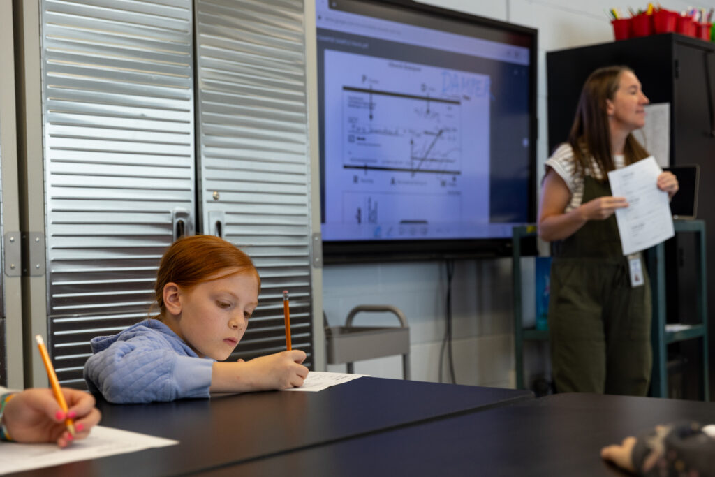 A fourth-grade student practices filling out paper checks as financial literacy teacher Erin Sherry guides the class through the process. (Photo/Ireland Hayes)