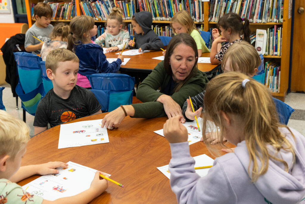 Erin Sherry helps a table of kindergarten students with a pre-test, an assessment used to see what knowledge the class is starting out with. The kindergarten test included concepts like what is the difference between a want and need, and what it means to save money. (Photo/Ireland Hayes)