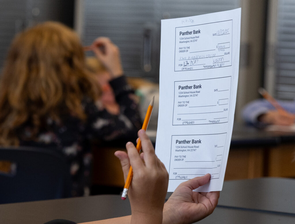 A fourth-grade student holds up his worksheet of “Panther checks” as he and his classmates are taught how to fill out a check. (Photo/Ireland Hayes)