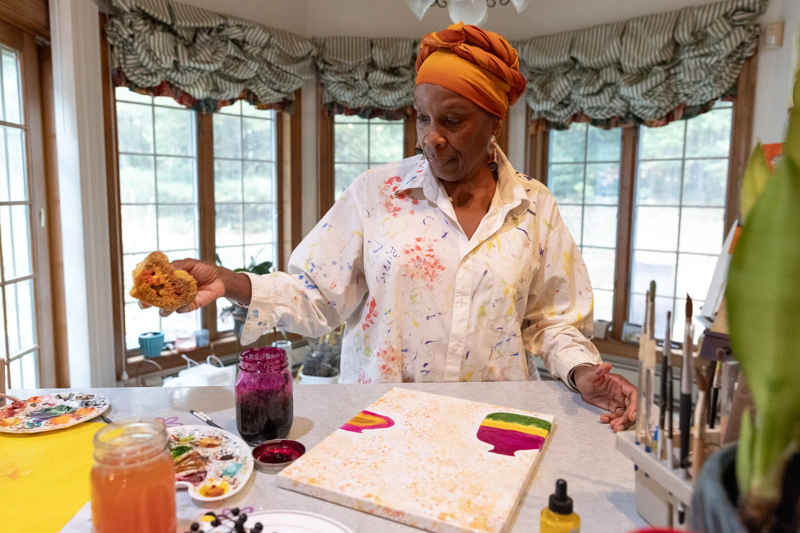 Local artist Sheila Jackson painting with a natural sponge at her kitchen island. (Photo/Ireland Hayes)