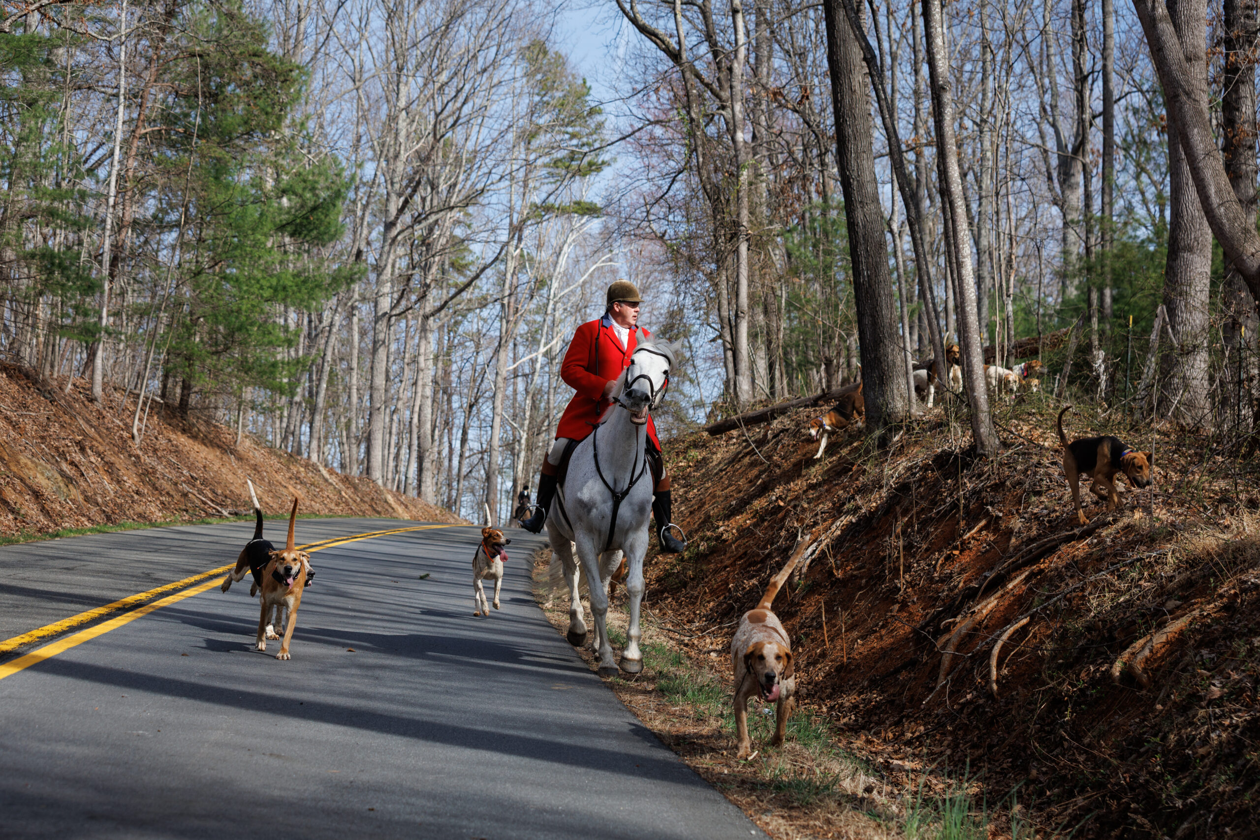 Master Michael Brown leads the hounds in a “full cry” when they picked up a fox’s scent. A whipper-in is in the background to prevent vehicles from passing on the road. (Photo/Luke Christopher)
